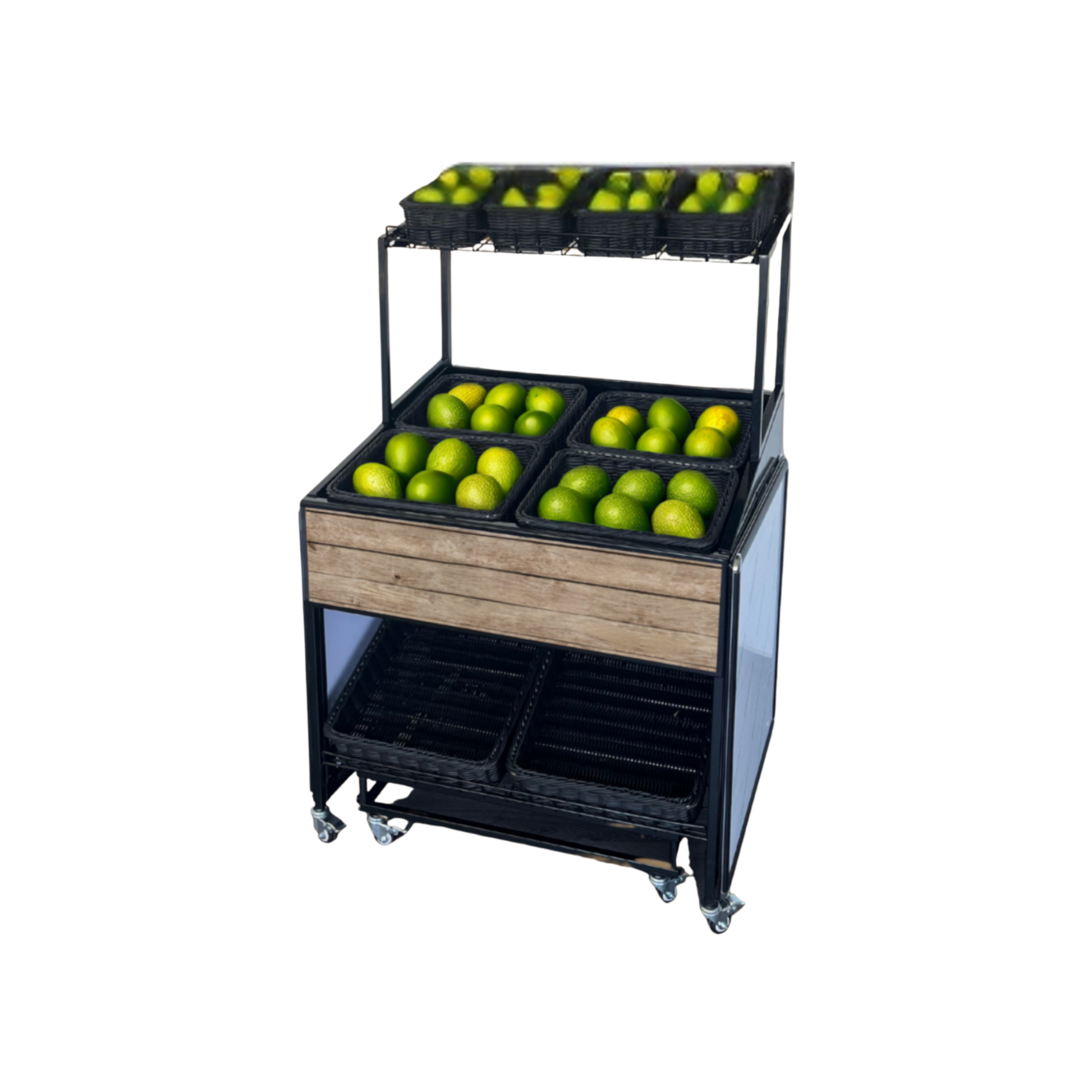 Set aus: Präsentationsinsel BASIS 80x60 cm, rollbar u. klappbar (Art.-Nr. 806090-E), Einschubsystem auf Rollen (Siehe Art.-Nr. 806090-1-E) und Aufbaurahmen mit Extraboden für zusätzliche Ebene. Ohne Zubehör (Rattannkörbe, Klappkisten, Dispenser für Papiertüten).